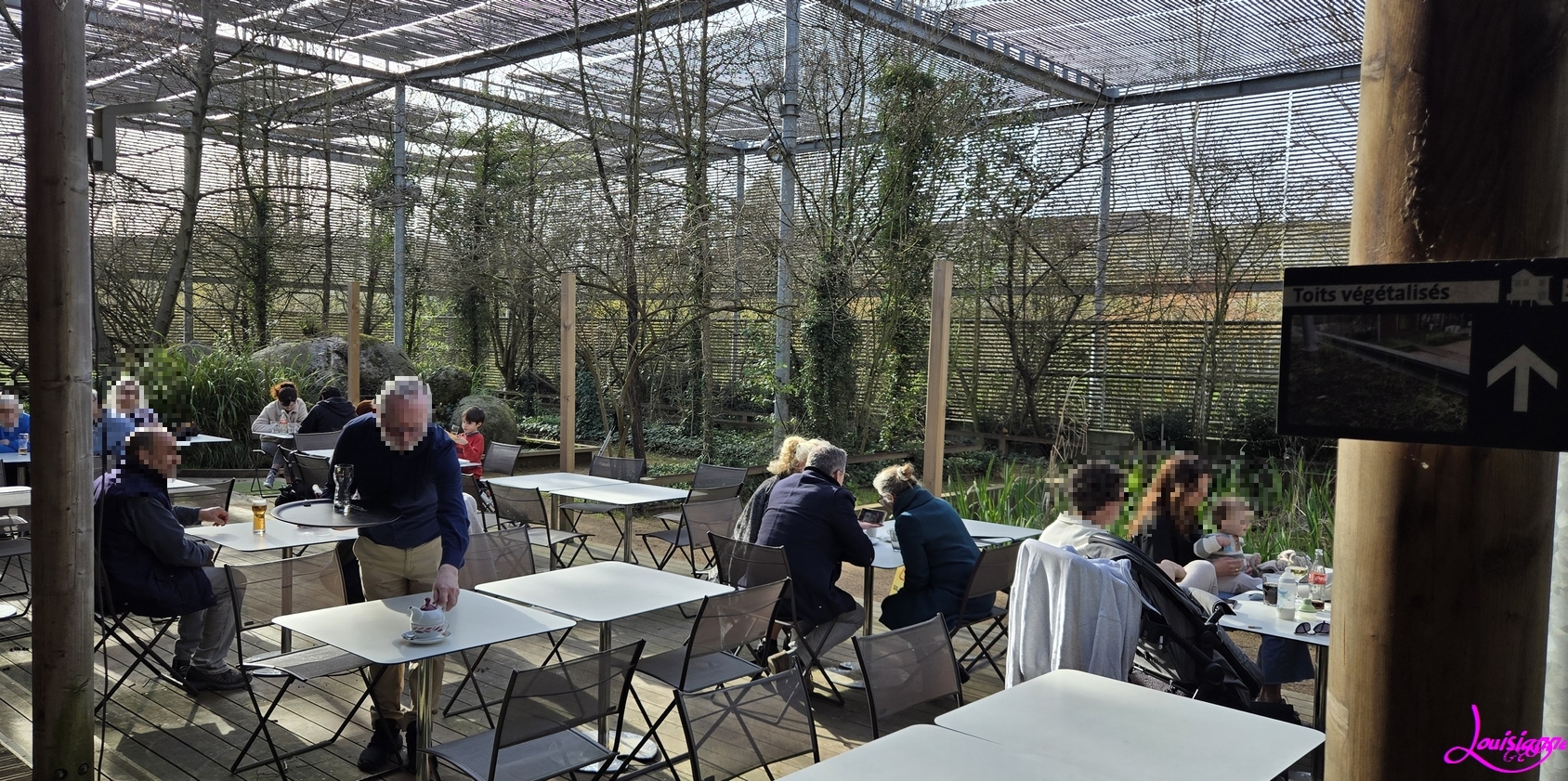 On peut manger dehors. Mais je ne vois pas beaucoup de végétaux sur le toit végétalisé !